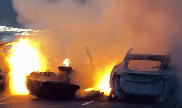 A Reuters szerint 17 autó pusztult el egy tűzvészben. Elon Musk, a cég tulajdonosa az X platformon közzétett bejegyzésében terrorizmusnak nevezte az esetet. Az olasz rendőrség különleges egysége (Digos) vizsgálja az esetet, és fontolóra veszik annak lehetőségét, hogy anarchisták szándékosan gyújtották fel a tüzet – erősítették meg biztonsági források a Reutersnek.