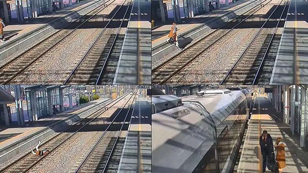 Az észak-lengyelországi Gdańsk Rębiechowo állomás térfigyelő kamerái április 15-én rögzítettek egy nőt, aki egy telefonbeszélgetés miatt a sínekre esett és beütötte a fejét.