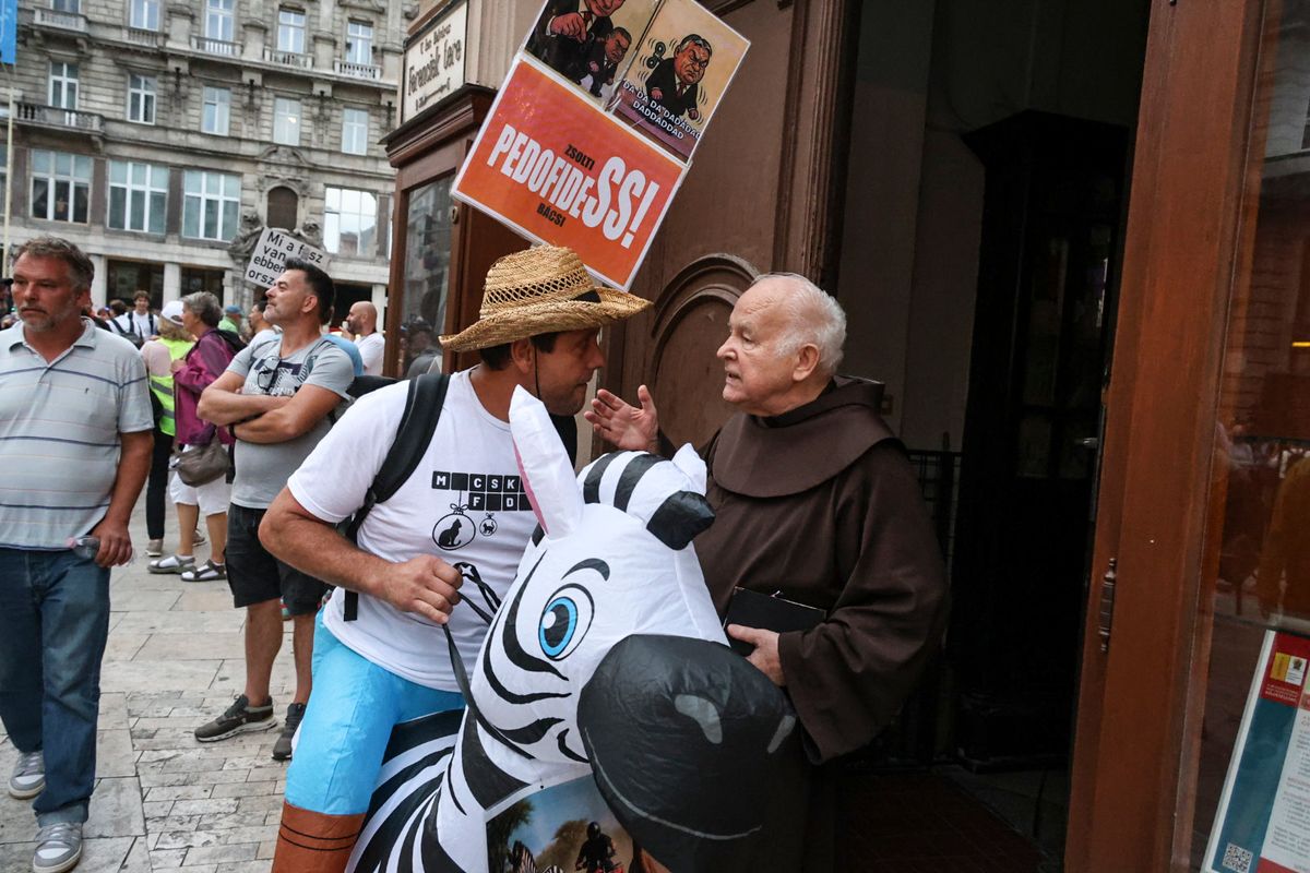 Hadházy szóváltásba keveredett Reisz Péter Pál atyával, aki alapvetően azt kifogásolta, hogy a tüntetést pont a templom mellé szervezték.