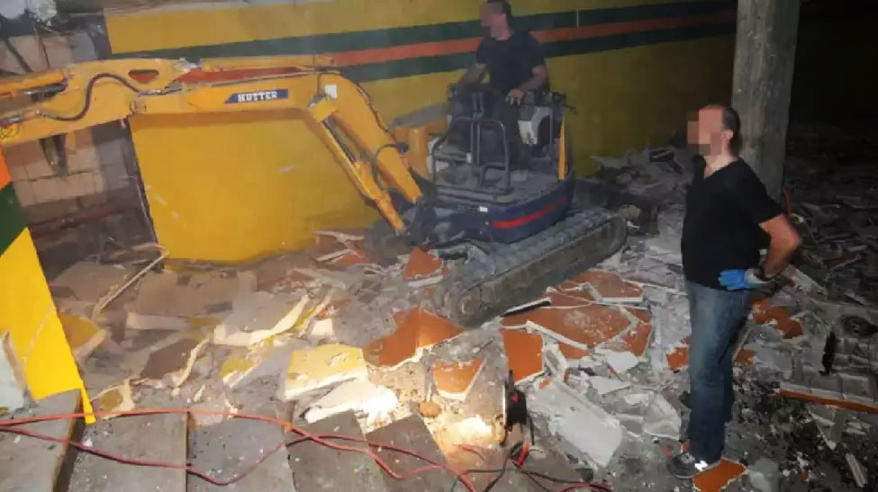 Más képeken ő maga felügyeli a pincéből vezető lépcsőn végzett ásatási munkálatokat. A fotóalbumok – ahogy a 24heures és a Blick is megjegyezte – a munka kézműves jellegét mutatják. Nincs azonosítható cég, nincsenek védőfelszerelések: a képek egy korlátozott, esetleg belső erőforrásokkal végzett felújításra utalnak. Ezt a benyomást megerősítette a Nouvelliste 2016 júniusi cikke is. A tulajdonos, Jacques Moretti, nem titkolta a munka eredetét: Szinte mindent magam csináltam. Nézzétek ezeket a falakat, 14 tonna száraz kő van rajtuk, Saint-Léonard-ból származnak!.
