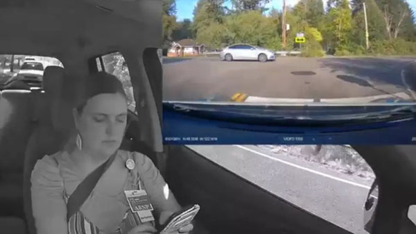 Egy autós kamera felvétele mutatja azt a pillanatot, amikor egy washingtoni autós vezetés közben SMS-t írt, és elvesztette uralmát a jármű felett, és az árokba csapódott egy Turo bérautóval. A videón látható, hogy a nő mindkét kezével használja a telefonját, miközben az úton halad.