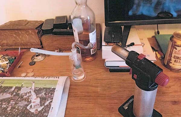 Blunt rámutatott a rendőröknek a nála lévő kábítószerekre, amelyek között volt 200 és 250 font közötti értékű kristálymet az éjjeliszekrényen, kristálymet és amfetamin keveréket tartalmazó műanyag üvegek, egy másik, 200 font értékű GBL-t tartalmazó üveg egy laptoptáskában, valamint egy zacskó kannabisz 5 és 10 font közötti értékben. A rendőrök lőpormaradványokkal teli mérlegeket, valamint „drogfogyasztáshoz szükséges eszközöket” is találtak. A Koronaügyészség által közzétett új képeken az otthonáról az éjjeliszekrénye látható, tele drogokkal, kémiakönyveknek tűnő tárgyakkal és több üveg vízzel. A házban máshol a képeken egy lángszóró, alkohol és egy doboz gyömbérsör látható kis poharak között.