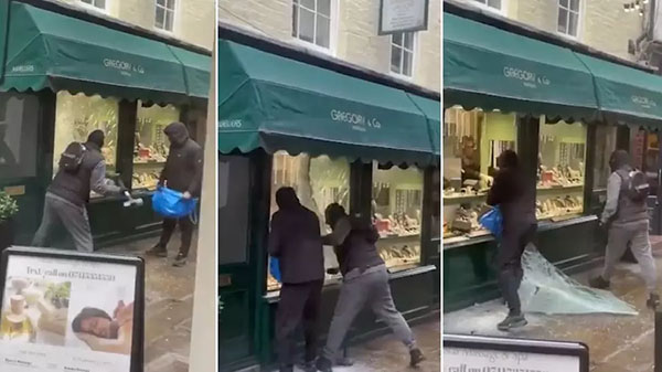 A megdöbbentő jelenet szombat reggel történt Richmondban, egy Nyugat-London egyik legbékésebb és legvirágzóbb körzetében. Egy szemtanú által forgatott és a közösségi médiában széles körben megosztott felvételen látható, amint két férfi megtámadja a családi ékszerboltot, a Gregory & Co.-t. A videón látható, ahogy a két férfi egy kalapáccsal veri a kirakatot. Miután betörik az üveget, leveszik, és elkezdik egy kék zacskóba dobálni a kiállított ékszereket. Az alkalmazottak éppen az ékszereket húzogatták, mielőtt a tolvajok ellopták azokat. Miközben a rablás javában zajlott, több üzletalkalmazott is látható volt belülről, amint megpróbálták kivenni az árut a vitrinből, és rángatták az ékszereket, mielőtt a tolvajok ellopták volna azokat. A támadók egyszer egy dobozszerű tárggyal is megütötték őket, de a kísérletük sikertelen volt, és a tolvajoknak sikerült elmenekülniük a megdöbbent szemtanúk szeme láttára.