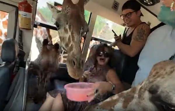 A felvételen látszik, ahogy a nő elhajítja a tálat az autón, mire a zavarodott lények tovább nyalogatják és harapdálják a lábát, a ruháját és a haját. Az autó sofőrje hátra lendítette a karját, hogy elüsse az állatokat, de csúfos kudarcot vallott, így a három zsiráf megrágcsálhatta az újdonságnak számító szandálokat. A sikoltozó hölgy napszemüvege is leesett az arcáról.