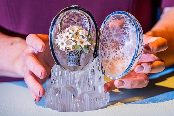 A tojást és az alapját hegyikristályból faragták, majd platina hópehely foglalatokkal díszítették. Belül egy meglepetés vár: egy fehér kvarc szellőrózsák csokor, arany drót szárakra rögzítve, platina kosárban.