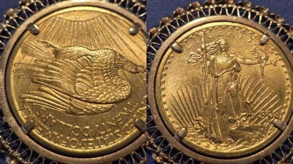 A lány azonnal mindennapi kiegészítőként akarta viselni a tárgyat, de az anyja úgy döntött, először kivizsgálja az eredetét. Miután feltöltötte a képeket az internetre, a numizmatikai szakértők gyorsan reagáltak, és azonosították a darabot egy 1908-ból származó Saint-Gaudens Double Eagle érmeként. A 90% arany és 10% réz ötvözetéből készült érme az Egyesült Államok történelmének egyik legértékesebb érméjének számít. Jellegzetes kialakítását, amely magában foglalja egy sas képét, valamint az olajággal és fáklyával díszített Szabadság-szobrot, Augustus Saint-Gaudens amerikai szobrász alkotta meg Theodore Roosevelt elnök kezdeményezésére.